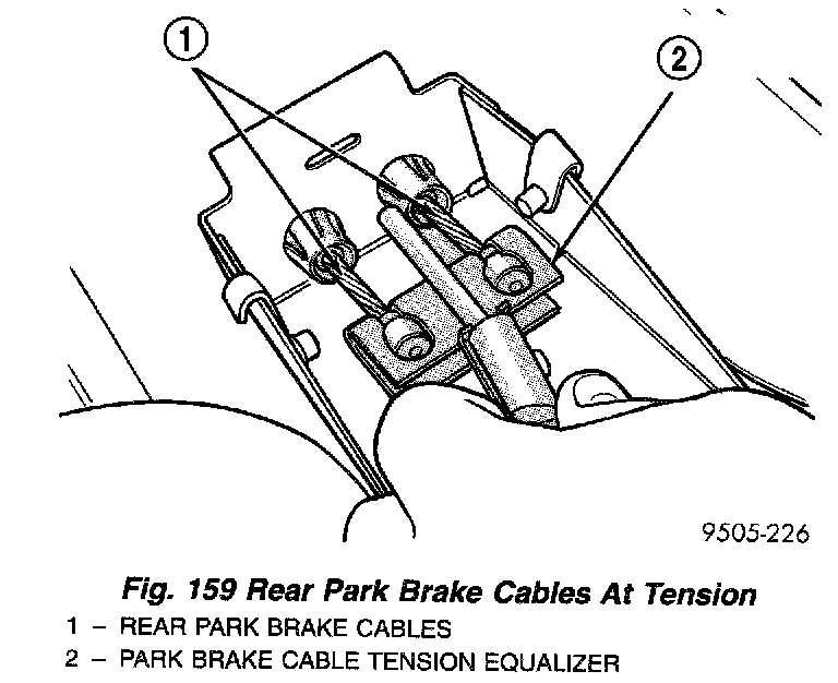 NOTE: Actuating the parking brake lever to its fully applied position one time after tightening the adjustment nut will yield (stretch) the bent nail portion of the tension equalizer approximately 1/4 inch. This process will correctly set the parking brake cable tension.