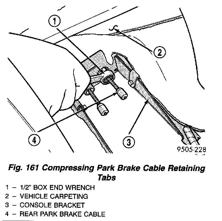 14. Install the box end of a 1/2 in. wrench over the park brake cable retainer as indicated. This will compress tabs on park brake cable retainer, allowing cable to be removed from console bracket. From under carpet, grasp park brake cable housing and pull cable straight out of console bracket.
