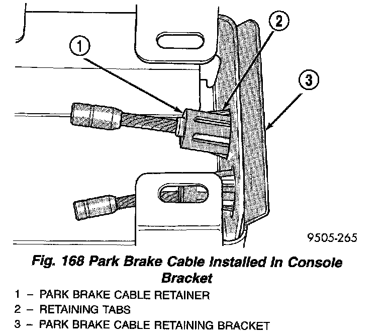 11. Route park brake cable under carpeting and up to park brake cable hole in console bracket on floor pan. Then install park brake cable into console bracket. Be sure tabs on park brake cable retainer, have expanded out to hold park brake cable in console bracket.