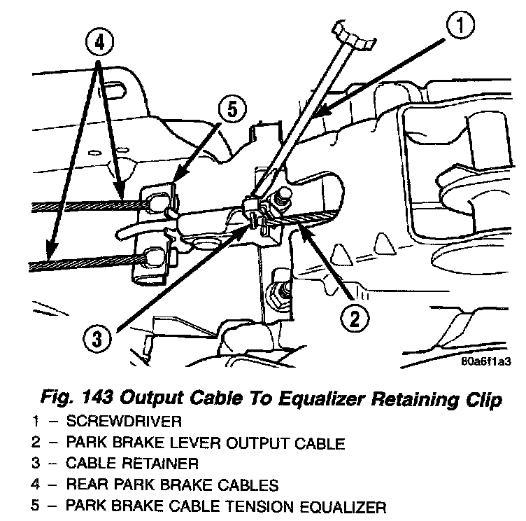 CAUTION: Discard output cable retaining clip and tension equalizer after removing it from the park brake output cable. A new tension equalizer and retaining clip is to be used when installing a new rear park brake cable.