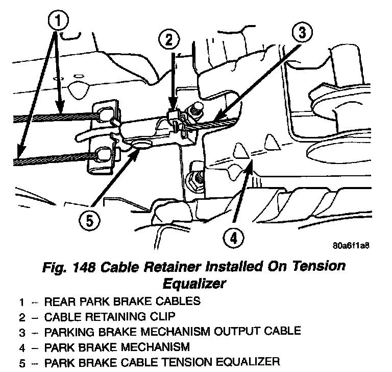 CAUTION: A new retainer must be used when installing the park brake mechanism output cable on the cable tension equalizer. Cable retainer usage is required to ensure output cable can not separate from tension equalizer.
