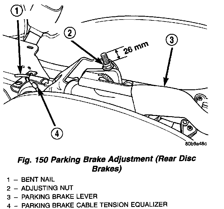 ^ On vehicles with REAR DISC BRAKES, tighten the adjusting nut on the parking brake lever output cable until 26 mm of thread is out past top edge of adjustment nut.
