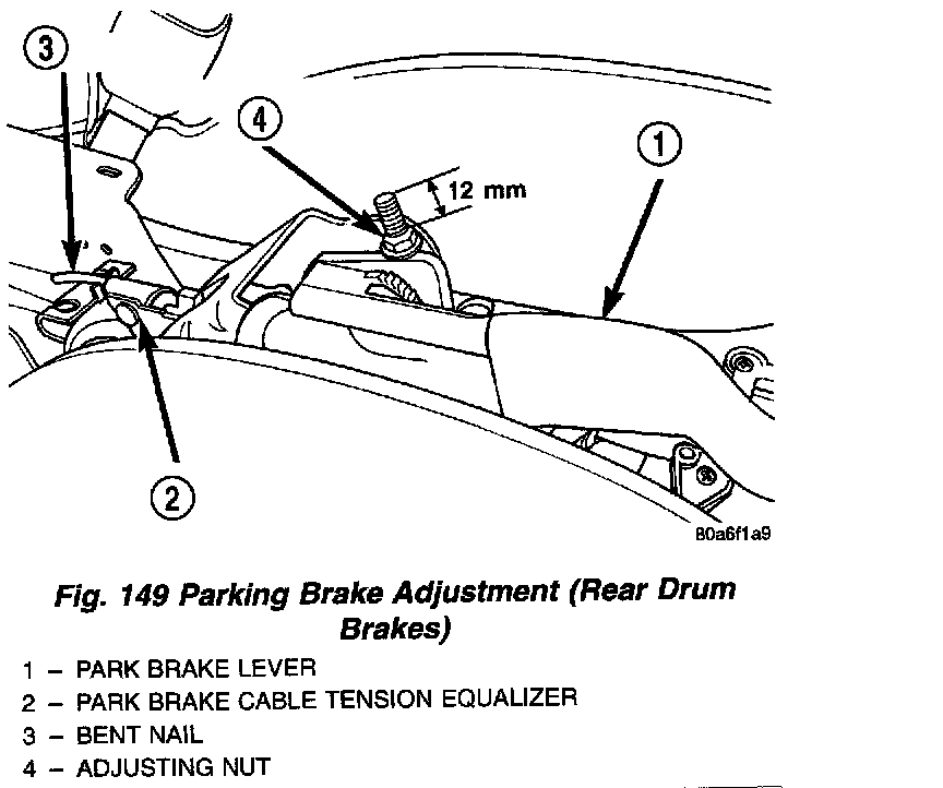^ On vehicles with REAR DRUM BRAKES, tighten the adjusting nut on the parking brake lever output cable until 12 mm of thread is out past top edge of adjustment nut.