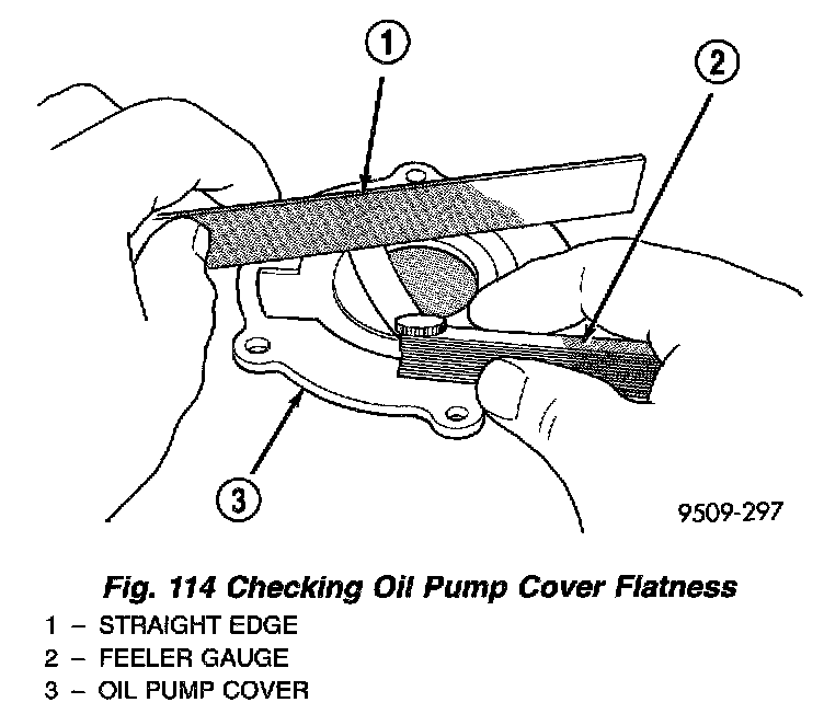 2. Lay a straightedge across the pump cover surface. If a 0.025 mm (0.001 inch) feeler gauge can be inserted between cover and straight edge, cover should be replaced (Fig. 114).
