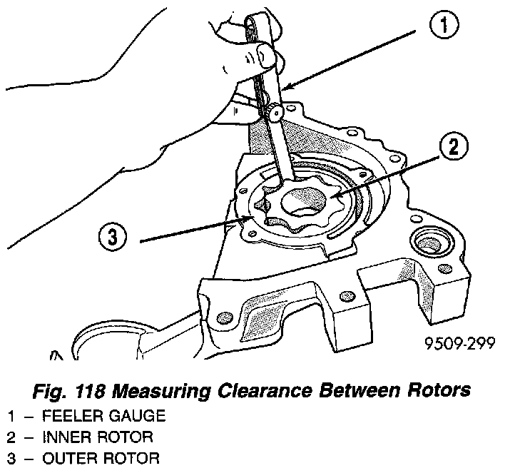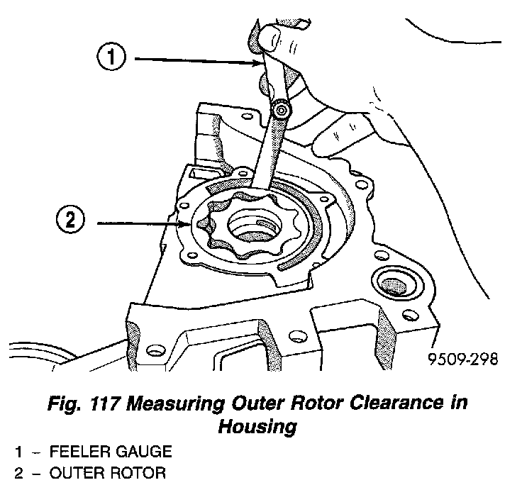 5. Slide outer rotor into pump housing, press to one side with fingers and measure clearance between rotor and housing. If measurement is 0.39 mm (0.015 inch) or more, replace housing only if outer rotor is in specification (Fig. 117).