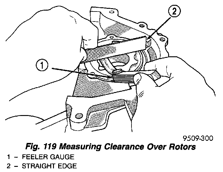 7. Place a straightedge across the face of the pump housing, between bolt holes. If a feeler gauge of 0.102 mm (0.004 inch), or more can be inserted between rotors and the straightedge, replace pump assembly, ONLY if rotors are in specifications (Fig. 119).