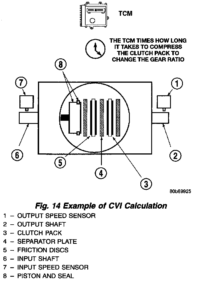 By comparing the two inputs, the TCM can determine transaxle gear ratio. This is important to the CVI calculation because the TCM determines CVI's by monitoring how long it takes for a gear change to occur (Fig. 14).