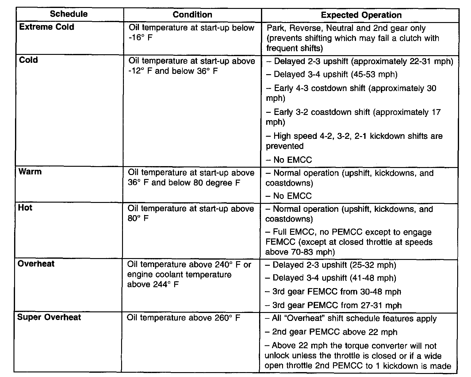 As driving conditions change, the TCM appropriately adjusts the shift schedule. Refer to the chart to determine the appropriate operation expected, depending on driving conditions.
