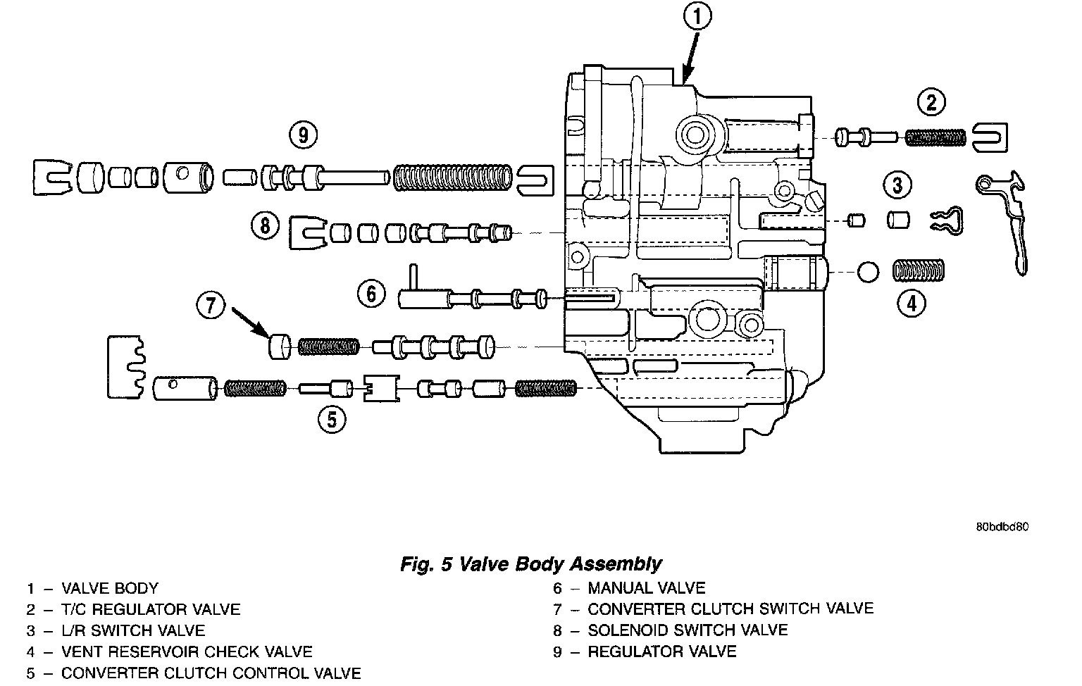 The valve body assembly consists of a cast aluminum valve body, a separator plate, and transfer plate. The valve body contains valves and check balls that control fluid delivery to the torque converter clutch, solenoid/pressure switch assembly, and frictional clutches. The valve body contains the following components (Fig. 5)