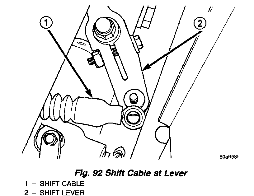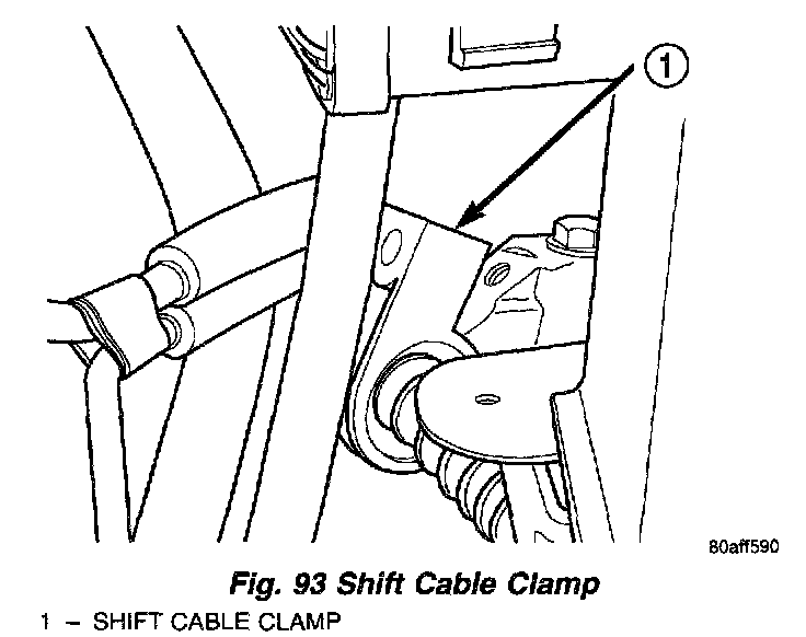 7. Remove shift cable at lever and at clamp on transaxle (Fig. 92) (Fig. 93).