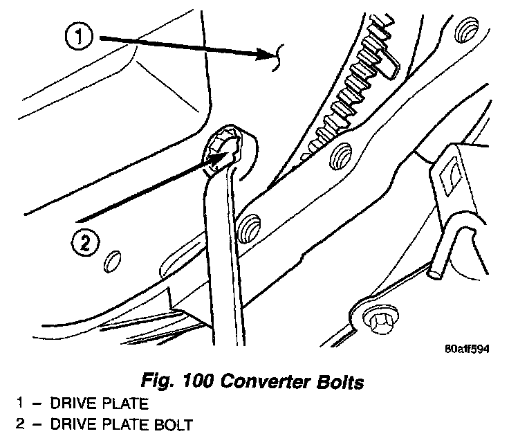 23. Rotate engine clockwise to line up converter bolts (Fig. 99). Remove converter bolts (Fig. 100). Mark converter for reassembly ease.