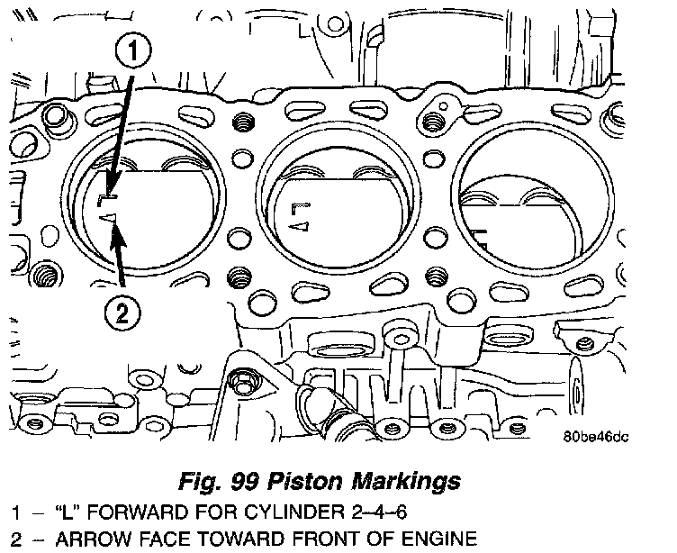 2. Identify pistons with matching cylinder. The pistons are not interchangeable from bank to bank. Pistons with the letter R and arrow toward the front of engine are to be installed in cylinders 1-3-5. Pistons with the letter L and arrow toward the front of engine are to be installed in cylinders 2-4-6 (Fig. 102).