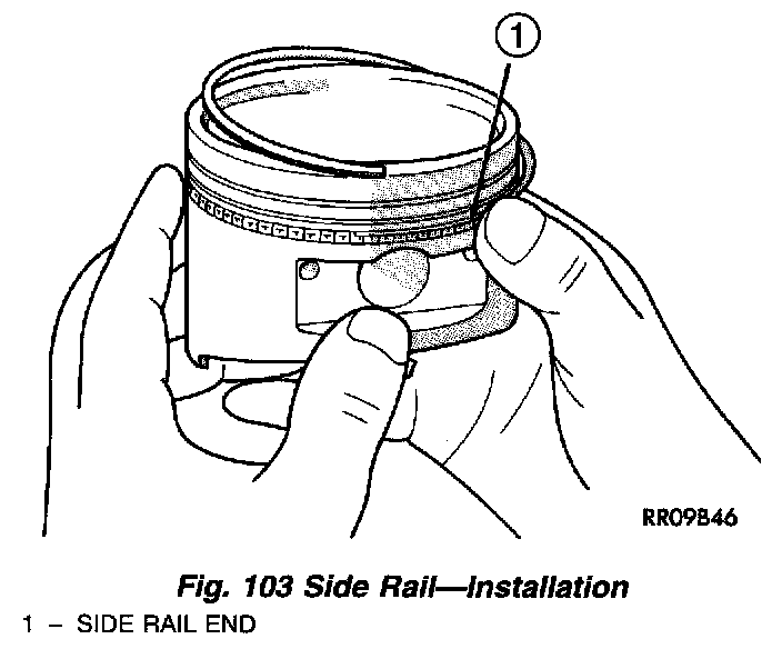 2. Install the side rails (upper rail first, then lower rail) by placing one end between the piston ring groove and the expander. Hold end firmly and press down the portion to be installed until side rail is in position. Do Not use a piston ring expander (Fig. 106).