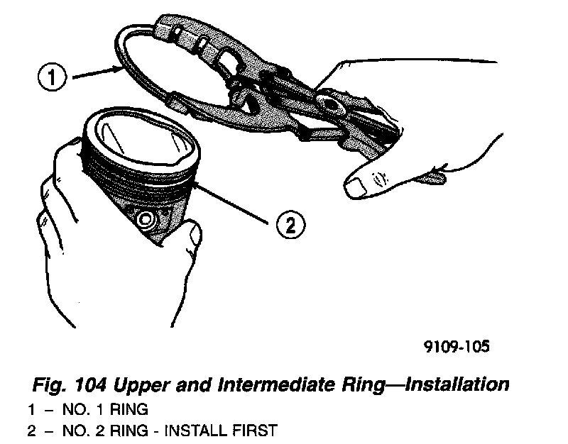 1. The No. 1 and No. 2 piston rings have a different cross section. Install rings with manufacturers mark and size mark facing up, to the top of the piston (Fig. 105).