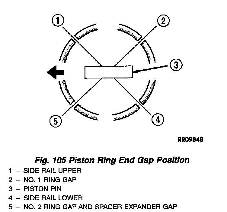 5. Position oil ring expander gap at least 45° from the side rail gaps but not on the piston pin center or on the thrust direction (Fig. 108).