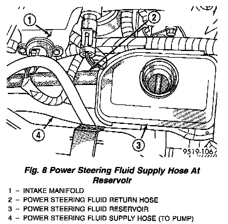 3. Install power steering fluid supply hose on power steering fluid reservoir fitting. Install hose clamp on power steering fluid supply hose at power steering fluid reservoir. Be sure hose clamp is installed on return hose past upset bead on power steering fluid reservoir.