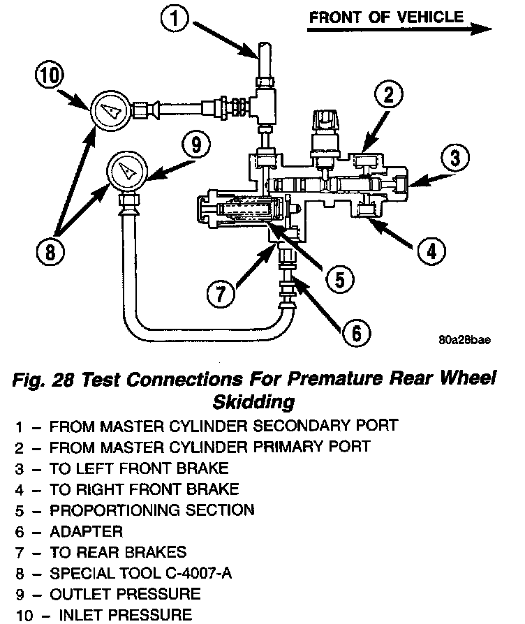 If premature rear wheel skid occurs on hard brake application, it could be an indication that a malfunction has occurred with the proportioning valve portion of the combination valve.To test the proportioning valve when the rear wheels of the vehicle slide first, leave the front brakes tubes connected to the combination valve, and proceed to test the proportioning valve for the rear brakes as follows: