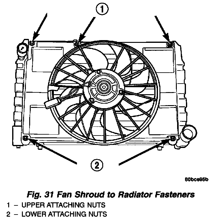 (1) Install the fan shroud assembly to radiator. Install the retaining nuts and tighten to 6 Nm (50 inch lbs.).