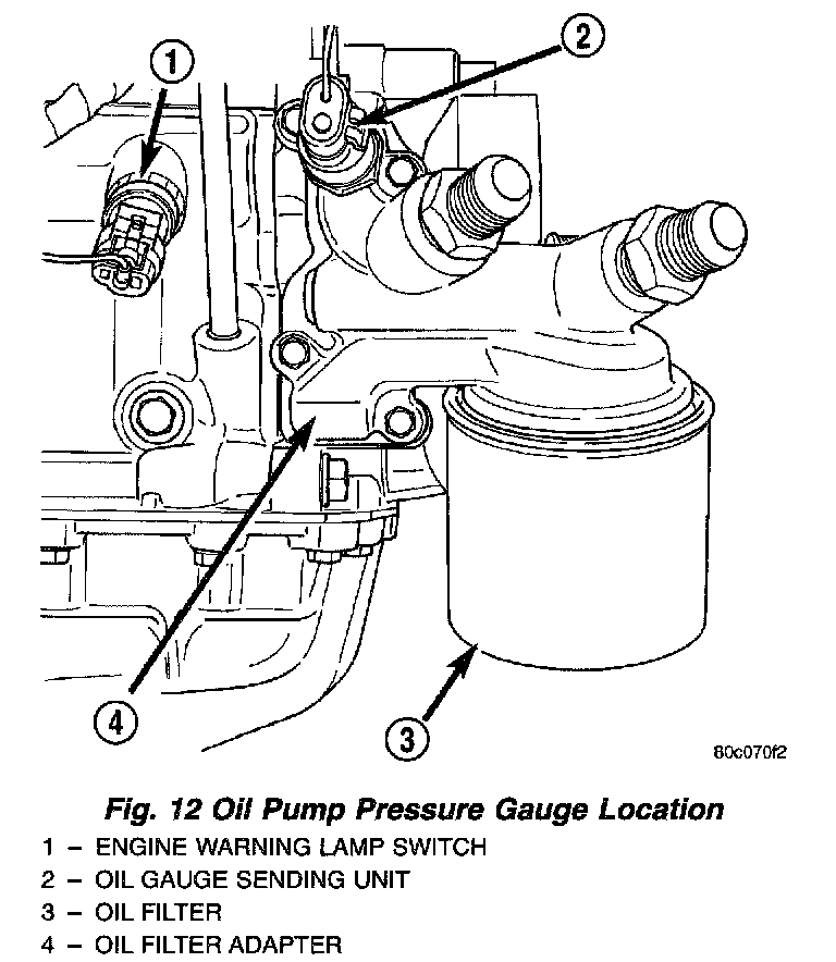 Check oil pressure using gauge at oil pressure switch location. Oil pressure should be 68.9 kPa (10 psi) at idle or 310 - 517 kPa (45 - 75 psi) at 3000 RPM.Fig. 12