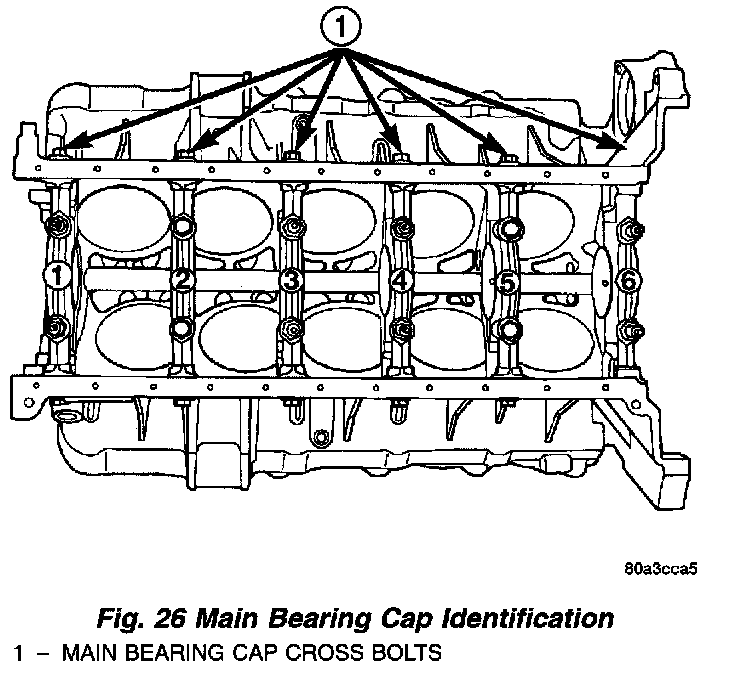 Bearing caps are not interchangeable and should be marked at removal to insure correct assembly. (Fig. 26) Upper and lower bearing halves are NOT interchangeable. Lower main bearing halves of 1, 2, 4, 5 and 6 are interchangeable. Upper main bearing halves of 1, 2, 4, 5 and 6 are interchangeable.