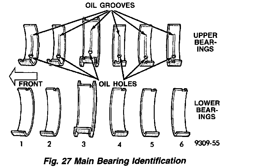 Bearing caps are not interchangeable and should be marked at removal to insure correct assembly (Fig. 26). Upper and lower bearing halves are NOT interchangeable. Lower main bearing halves of 1, 2, 4, 5 and 6 are interchangeable. Upper main bearing halves of 1, 2, 4, 5 and 6 are interchangeable.