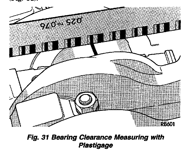 (5) Carefully remove the bearing cap and measure the width of the Plastigage at the widest part using the scale on the Plastigage package (Fig. 31). For proper clearances, refer to Specification in Crankshaft, Engine. If the clearance exceeds the specified limits, replace the main bearing(s) and if necessary, have the crankshaft machined to next undersize. Also refer to Measuring Main and Connecting Rod Bearing Clearance in Service Procedures.