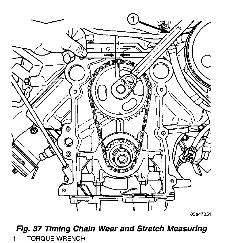 (1) Place a scale next to timing chain so that any movement of chain may be measured.(2) Place a torque wrench and socket on camshaft sprocket attaching bolt and apply torque in direction of crankshaft rotation to take up slack; 41 Nm (30 ft. lbs.) with cylinder head installed or 20 Nm (15 ft. lbs.) with cylinder heads removed. With a torque applied to the camshaft sprocket bolt, crankshaft should not be permitted to move. It may be necessary to block crankshaft to prevent rotation.