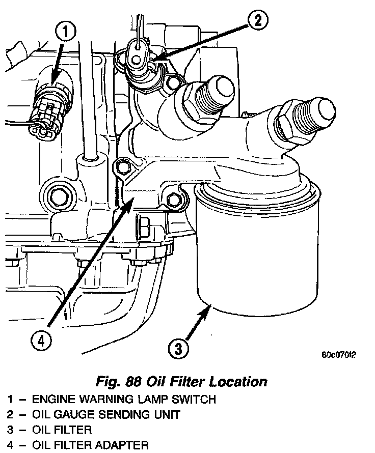 (1) Using suitable oil filter wrench, unscrew filter from base and discard (Fig. 88).