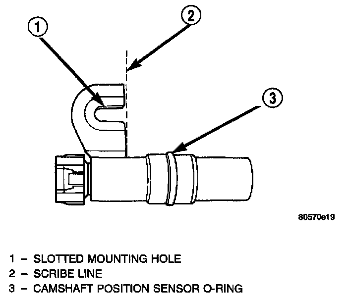 6. Install the sensor into the timing case/cover with a slight rocking action until the sensor is aligned to scribe line. The paper spacer can be used if reinstalling a used sensor.