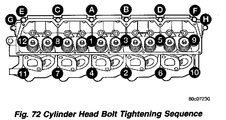 (c) After head bolts 1 - 12 have been tightened to specifications, tighten valley bolts A - H in sequence shown to 11 Nm (95 in. lbs.).