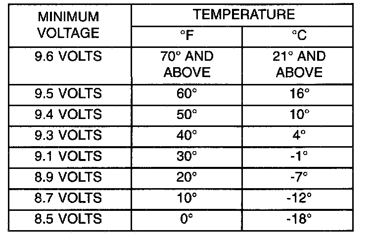 5. Voltage drop Will vary according to battery temperature at the time of the load test. Battery temperature can be estimated by the temperature of exposure over the preceding several hours. If the battery has been charged or boosted a few minutes prior to the test, the battery would be slightly warmer. Refer to Load Test Temperature table for proper loaded voltage reading.