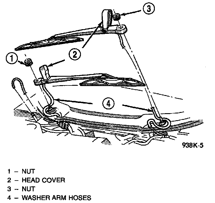 Before installing the wiper arm and blade, turn the wiper motors ON, then turn wiper switch OFF so that the wiper motors will stop in the PARK position. Set arm on pivot and position it in the PARK position. Tighten the nut to 9.8 - 13.7 Nm (86.7 - 121.3 in. lbs.). The washer hose is connected to the arm by routing the hose to the outside of the pivot shaft of the wiper motor.