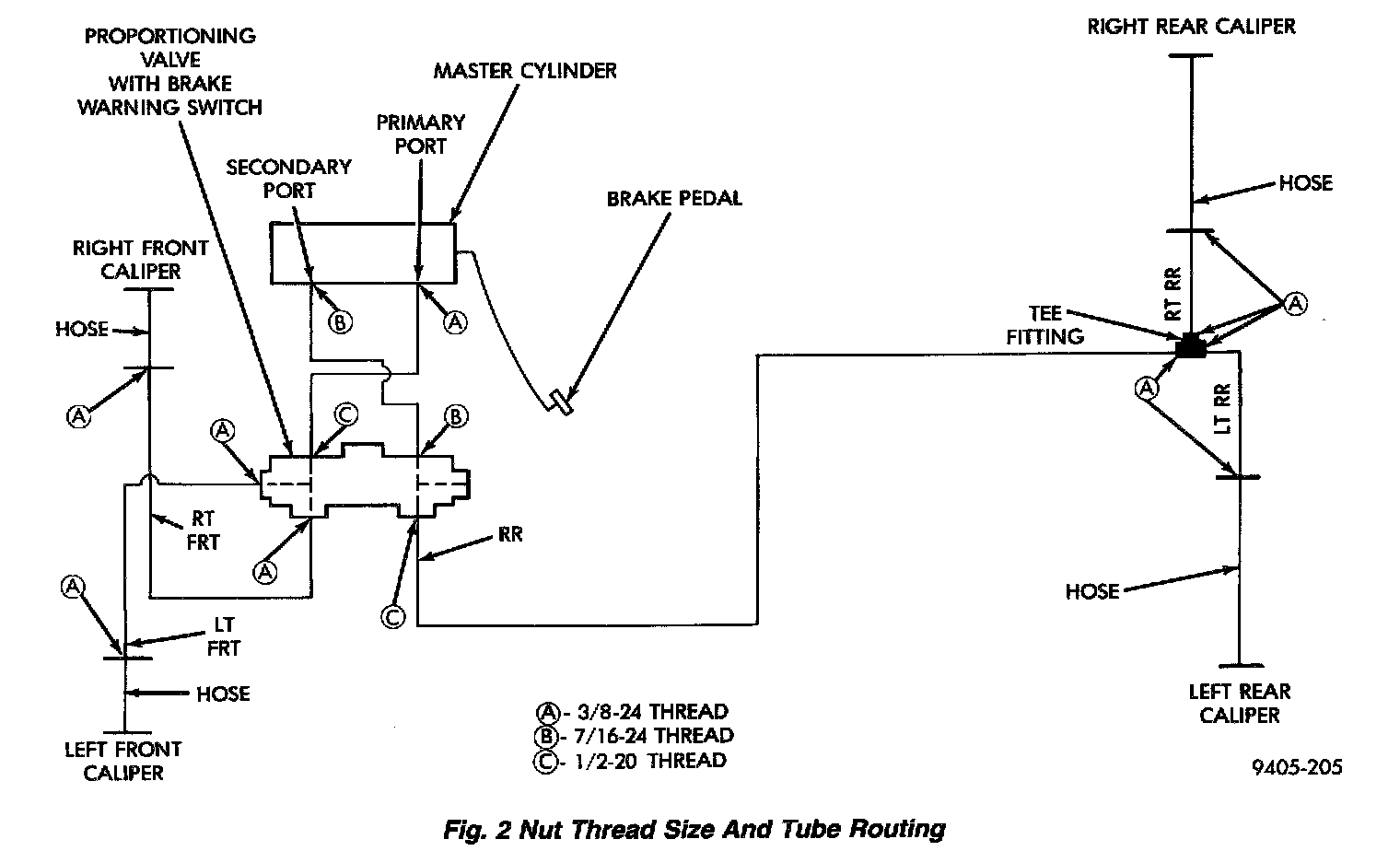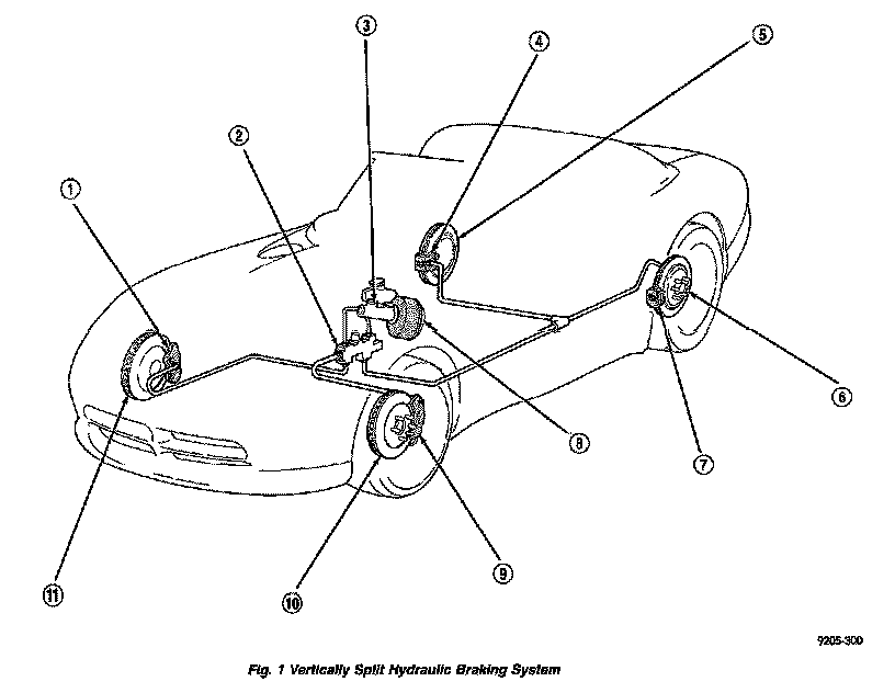 The brakes hydraulic system on this vehicle is vertically split. On a vertically split hydraulic system, the pressure in the hydraulic system is split front to rear, with both front brakes on one hydraulic system and both rear brakes on the other. This unlike a conventional front wheel drive vehicle which has a hydraulic system which is diagonally split, having the left front and right rear brake on one hydraulic system and the right front and left rear brake on the other.