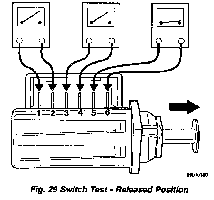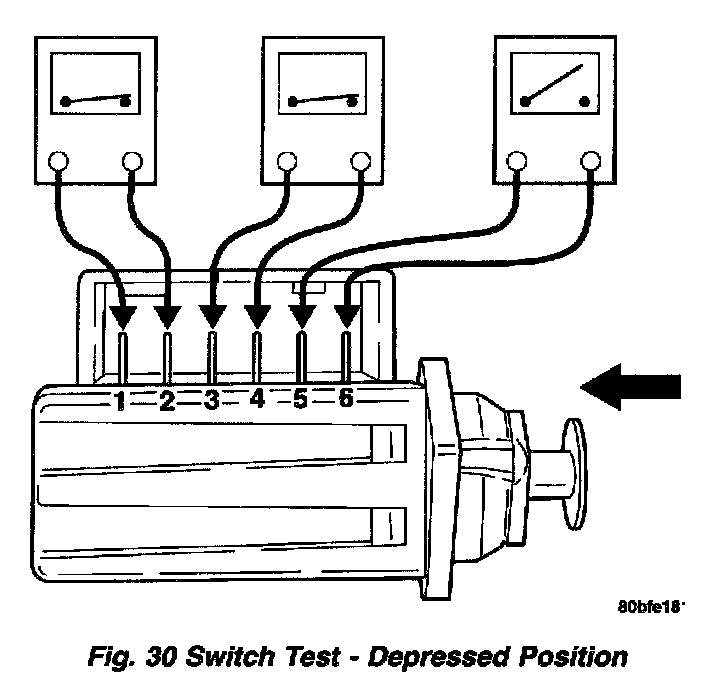 4. With the switch in the depressed position (plunger pushed in), use an ohmmeter to test each of the three internal switches as shown . You should achieve the results as listed in the figure.