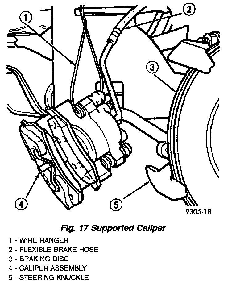 5. Hang the caliper off to the side using wire or bungee cord. Do not allow the caliper to be supported by the flexible brake hose. Damage to the flexible brake hose may result.
