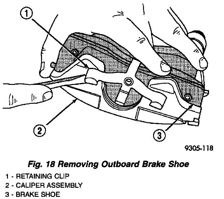 6. Remove outboard brake shoe by prying the shoe retaining clip over raised area on caliper. Then slide the brake shoe off the caliper.