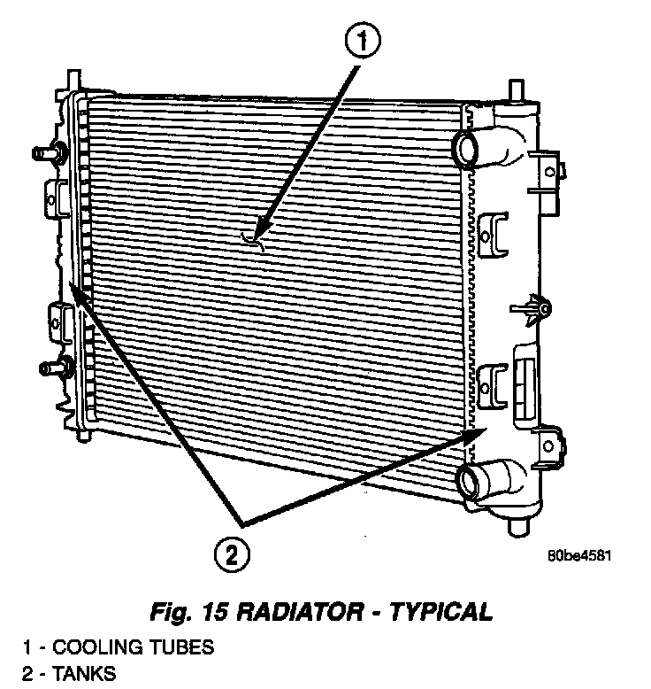 DESCRIPTIONThe radiators are cross-flow types (horizontal tubes) with design features that provide greater strength as well as sufficient heat transfer capabilities to keep the engine satisfactorily cooled. The radiator cooling tubes are made of aluminum and the side tanks are plastic. The radiator is positioned in the front part of the engine compartment to allow air flow across the cooling fins while vehicle is in motion.