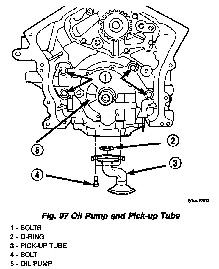 4. Install oil pump attaching bolts. Tighten bolts to 28 Nm (250 in. lbs.) (Fig. 97).