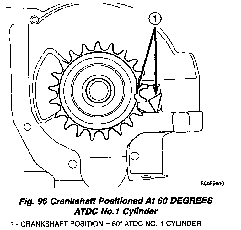 CAUTION: Crankshaft position must be at 60° ATDC of No.1 cylinder before installing oil pump (Fig. 96). This position will properly locate oil pump. If not properly located, severe damage to oil pump can occur.