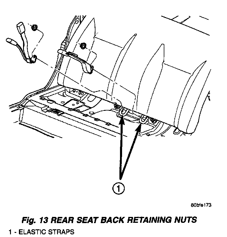 WARNING: INSPECT THE CONDITION OF THE SHOULDER/LAP BELT. REPLACE THE RETRACTOR IF THE BELT IS CUT, FRAYED, TORN, OR DAMAGED IN ANY WAY.Fig.13 Rear Seat Back Retaining Nuts: