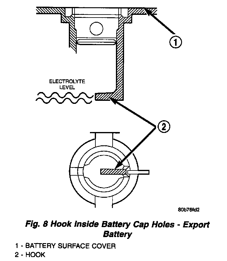 2. Look through the battery cap holes to determine the level of the electrolyte in the battery (Fig. 8). The electrolyte should be approximately 1 centimeter above the battery plates or until the hook inside the battery cap holes is covered.