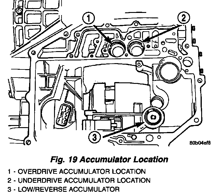 (8) Remove overdrive accumulator and springs (Fig. 18) (Fig. 19).
