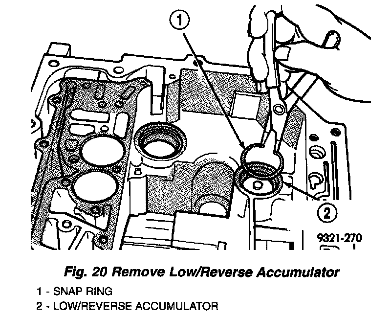 (9) Remove the low/reverse accumulator snap ring (Fig. 20).