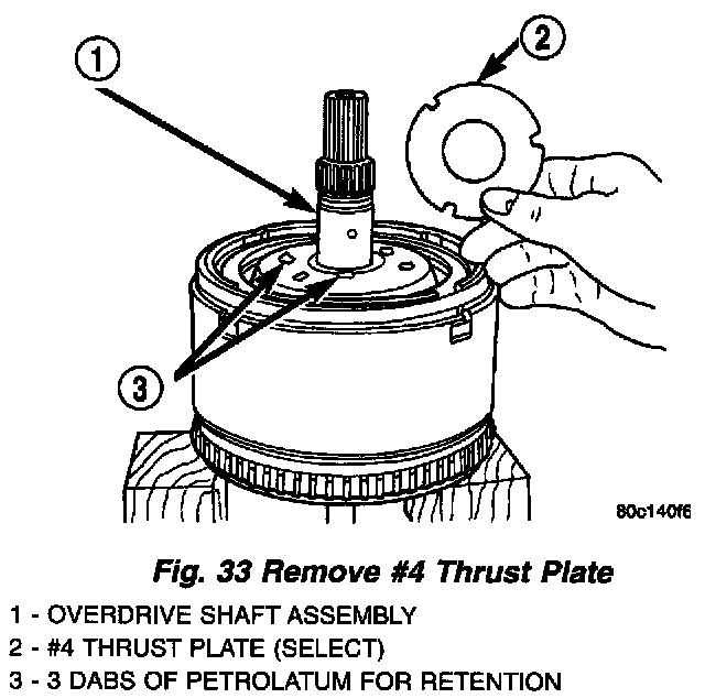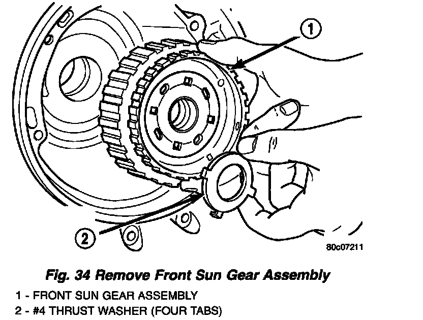 (22) Remove front sun gear assembly and # 4 thrust washer (if still in place) (Fig. 34).