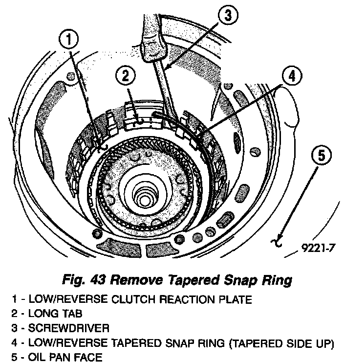 (30) Remove one (1) low/reverse clutch disc to facilitate snap ring removal (Fig. 44).