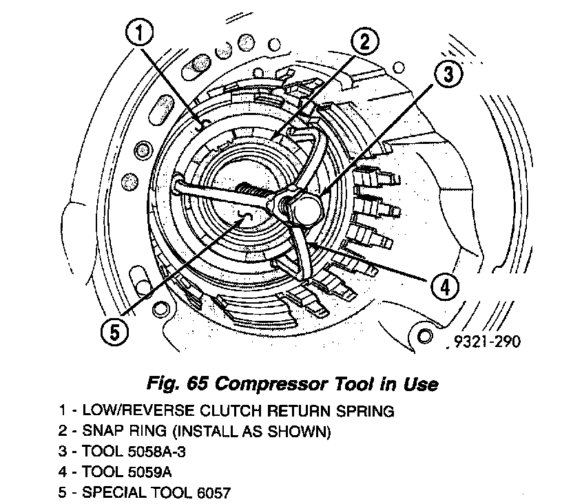 (25) Install and load Tool 5058 to remove 2/4 clutch retainer snap ring (Fig. 38).