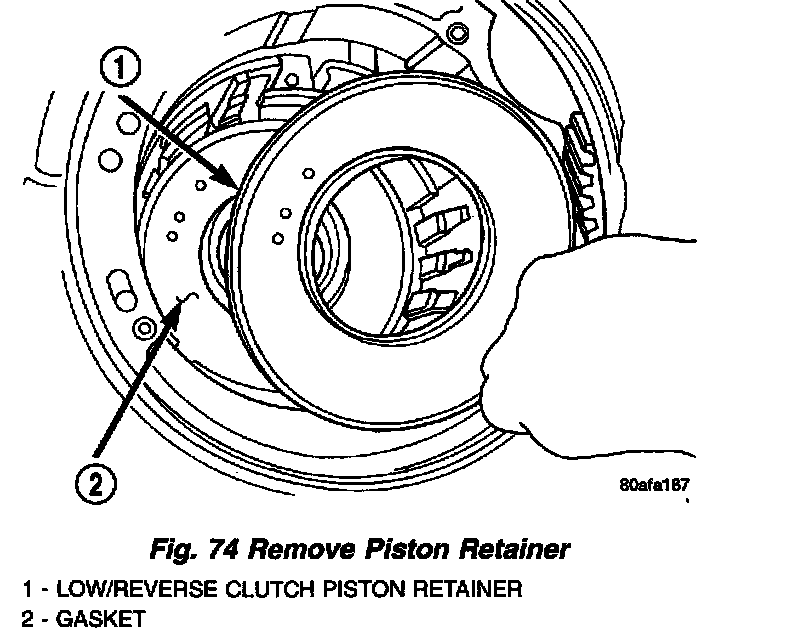 (56) Remove low/reverse piston retainer (Fig. 74).