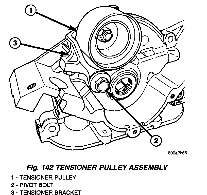 3. Inspect pivot bolt for free movement in tensioner bracket (Fig. 142). Replace assembly if seized or excessive looseness.