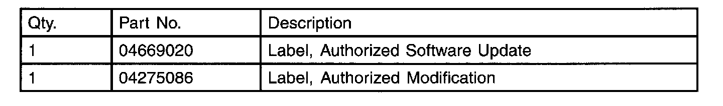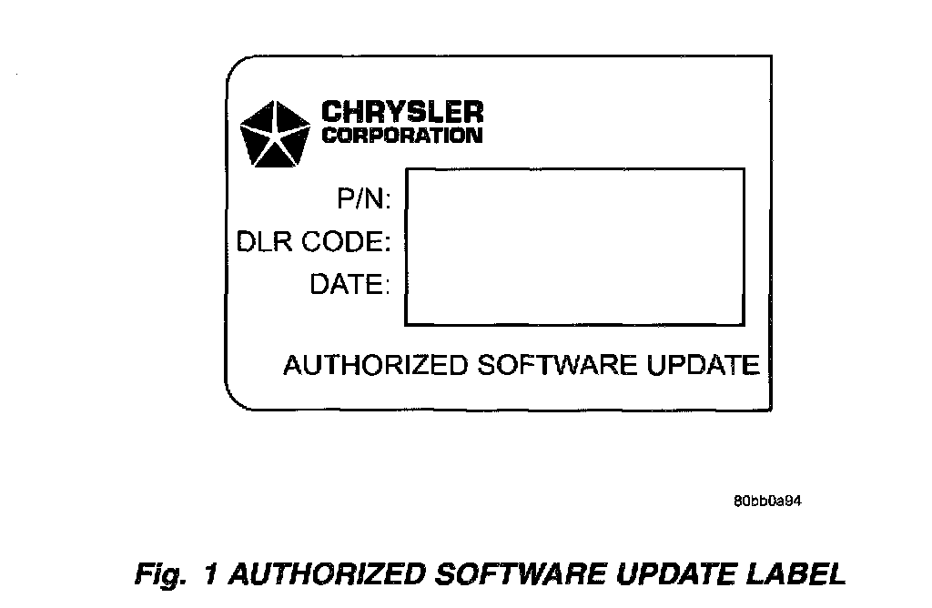 2. Type the necessary information on the "authorized Software Update Label" p/n 04669020 (Fig. 1). Attach the label to the PCM and cover the label with the clear plastic overlay. Type the necessary information on the "Authorized Modification Label" p/n 04275086 (Fig. 2) and attach the label near the VECI label.