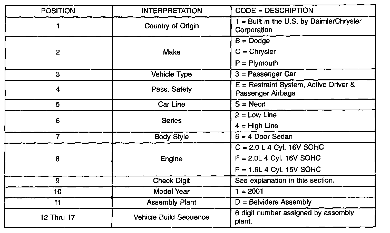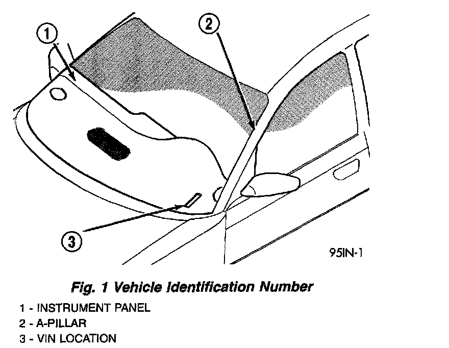 The Vehicle Identification Number (VIN) is located on the upper left corner of the instrument panel, near the left A-Pillar. The VIN consists of 17 characters in a combination of letters and numbers that provide specific information about the vehicle (Fig. 1). Refer to VIN Code Decoding Chart.